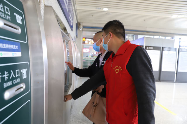 (指導(dǎo)旅客在自動售票機上取票)