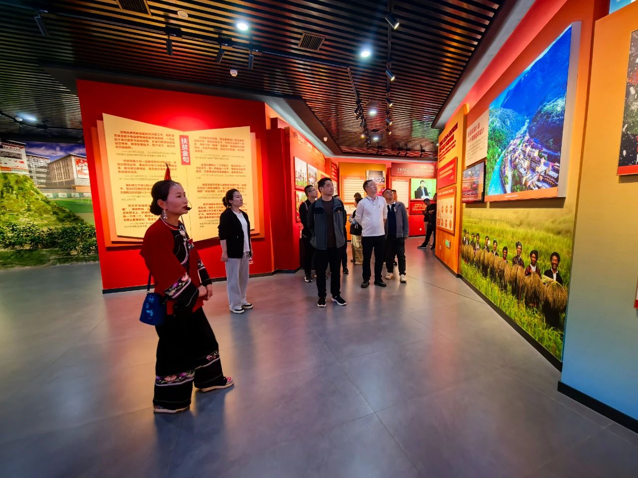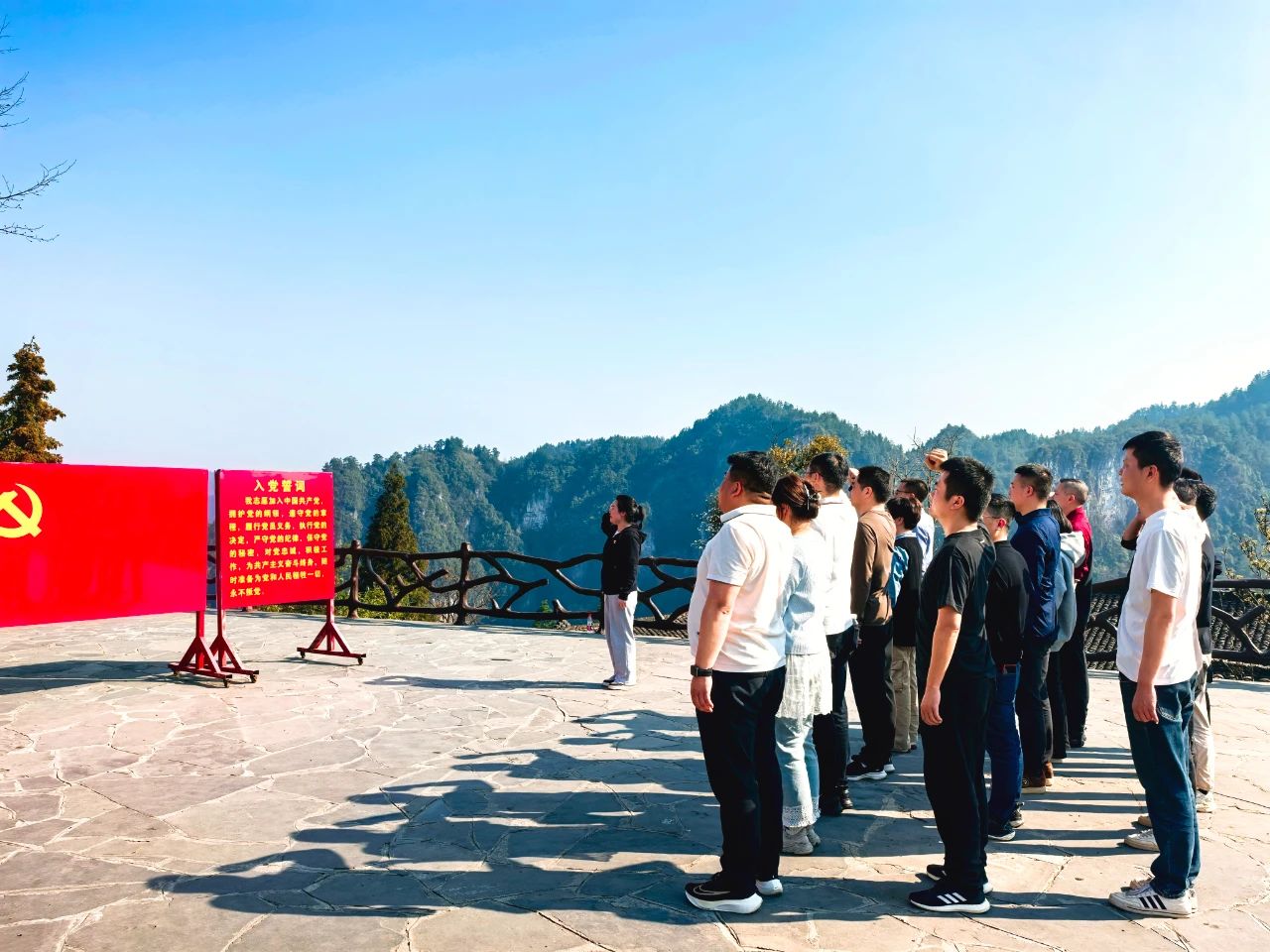 隨后,大家在講解員的帶領(lǐng)下,參觀了精準(zhǔn)扶貧主題陳列館,重走習(xí)近平總書(shū)記考察路線,還參觀了苗繡非遺扶貧工坊等標(biāo)志性場(chǎng)所,親身感受了十八洞村在黨的關(guān)懷下,從貧窮落后小山村到脫貧攻堅(jiān)樣板村的美麗蛻變。最后,全體黨員在精準(zhǔn)扶貧廣場(chǎng)重溫入黨誓詞,鏗鏘有力的誓言在美麗的山谷回蕩,傳遞著全體黨員們“聽(tīng)黨話、跟黨走”的堅(jiān)定信念。